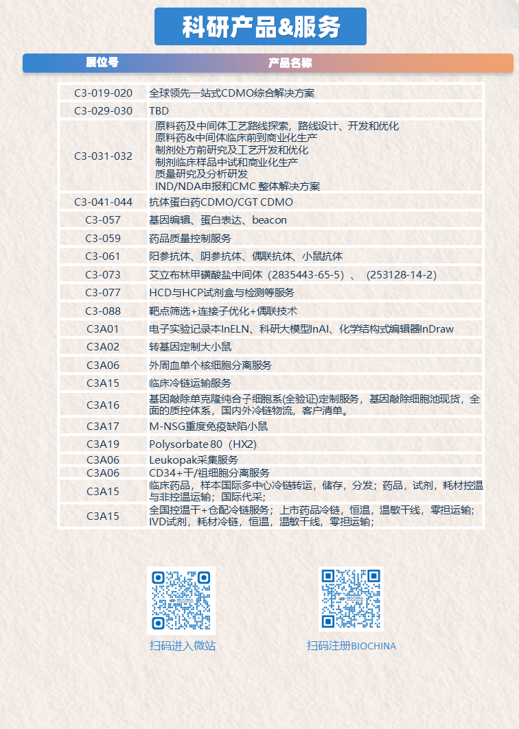 BIOCHINA2026 汇聚原料和试剂、尖端仪器设备与创新技术服务全链条解决方案,助您破解科研路上的各类难题。即刻报名参与,锁定逛展名额,更多硬核产品、前沿技术等你来解锁!我们期待与您在BIOCHIA2026现场见!