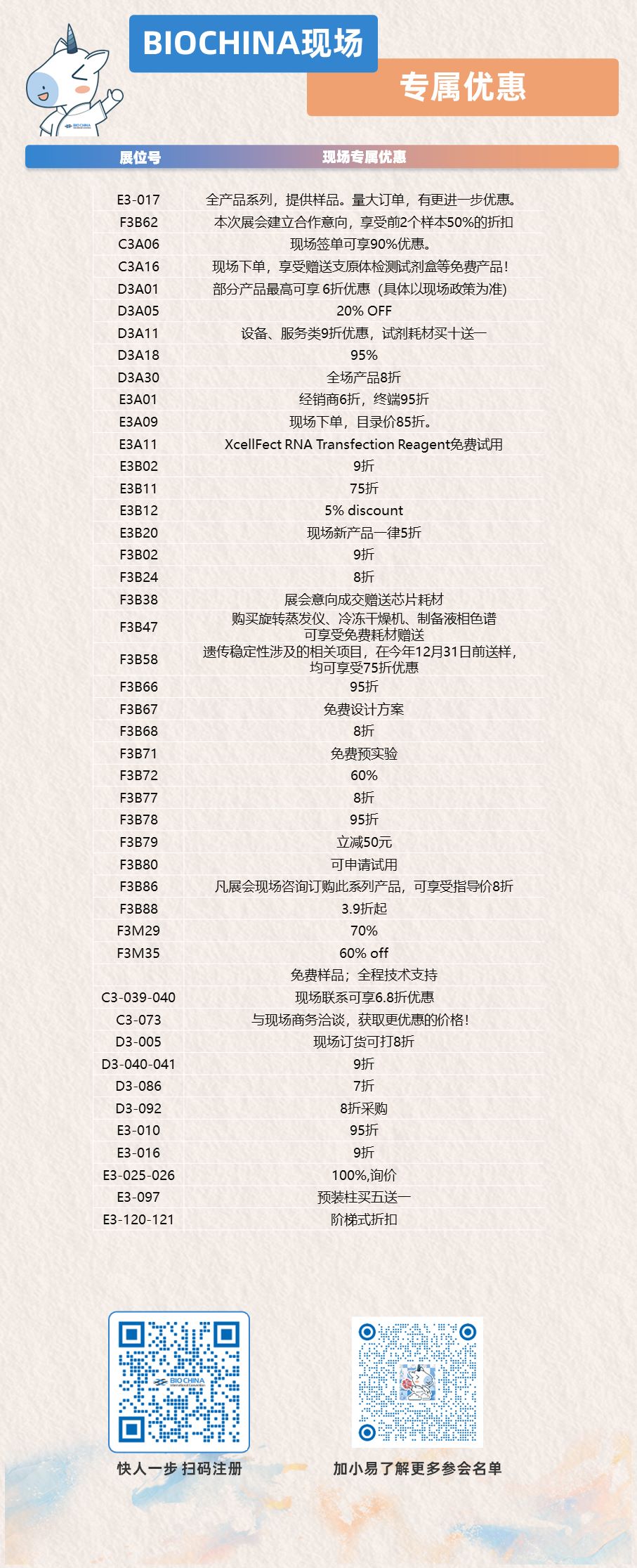 采购看过来,一场汇聚400+展商、超值优惠、产品试用的采购盛宴,正在向您招手! 立即报名注册,提前锁定展会参会资格,若您想提前了解更多展商优惠详情,欢迎添加小易咨询,期待您在BIOCHINA2026现场实现高性价比采购。
