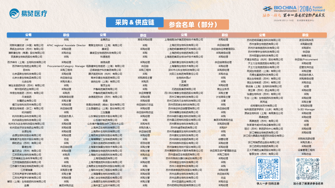 BIOCHINA2026观众端报名注册已开启,这段时间我们收到了不少采购伙伴的报名,部分参会名单已新鲜出炉,他们来自全国各地的药企大厂、生物技术公司、科研机构,对BIOCHINA展会充满热情,并且持续火热报名中。