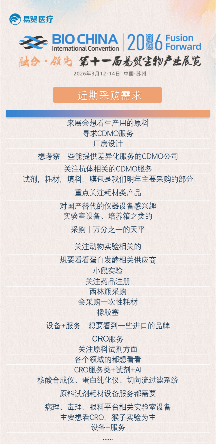 目前我们已经收到博腾股份、药明奥测、血霁生物、纳微科技、怡道生物、基石药业、晶云药物、聚微生物等公司的报名,他们都带着采购清单来,期待在展会上找到匹配的供应商。