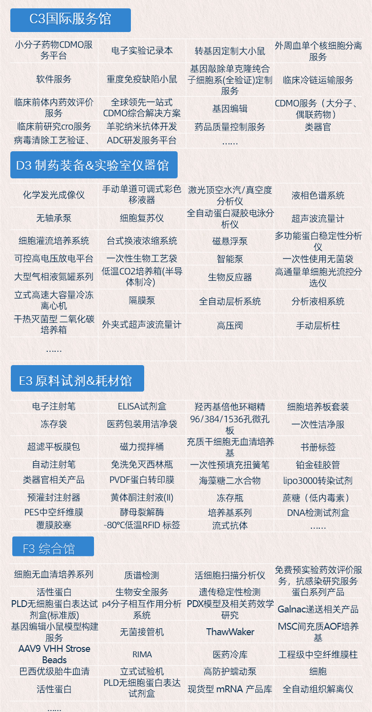 BIOCHINA2026展览计划设实验室仪器馆、制药装备馆,原料试剂馆、国际服务馆、耗材馆,综合馆六大展馆,目前已经有部分展商在易享线上平台上传了相关主推产品,收集如下图所示,覆盖生物产业研发、生产、应用全流程,形成丰富的产业生态矩阵。