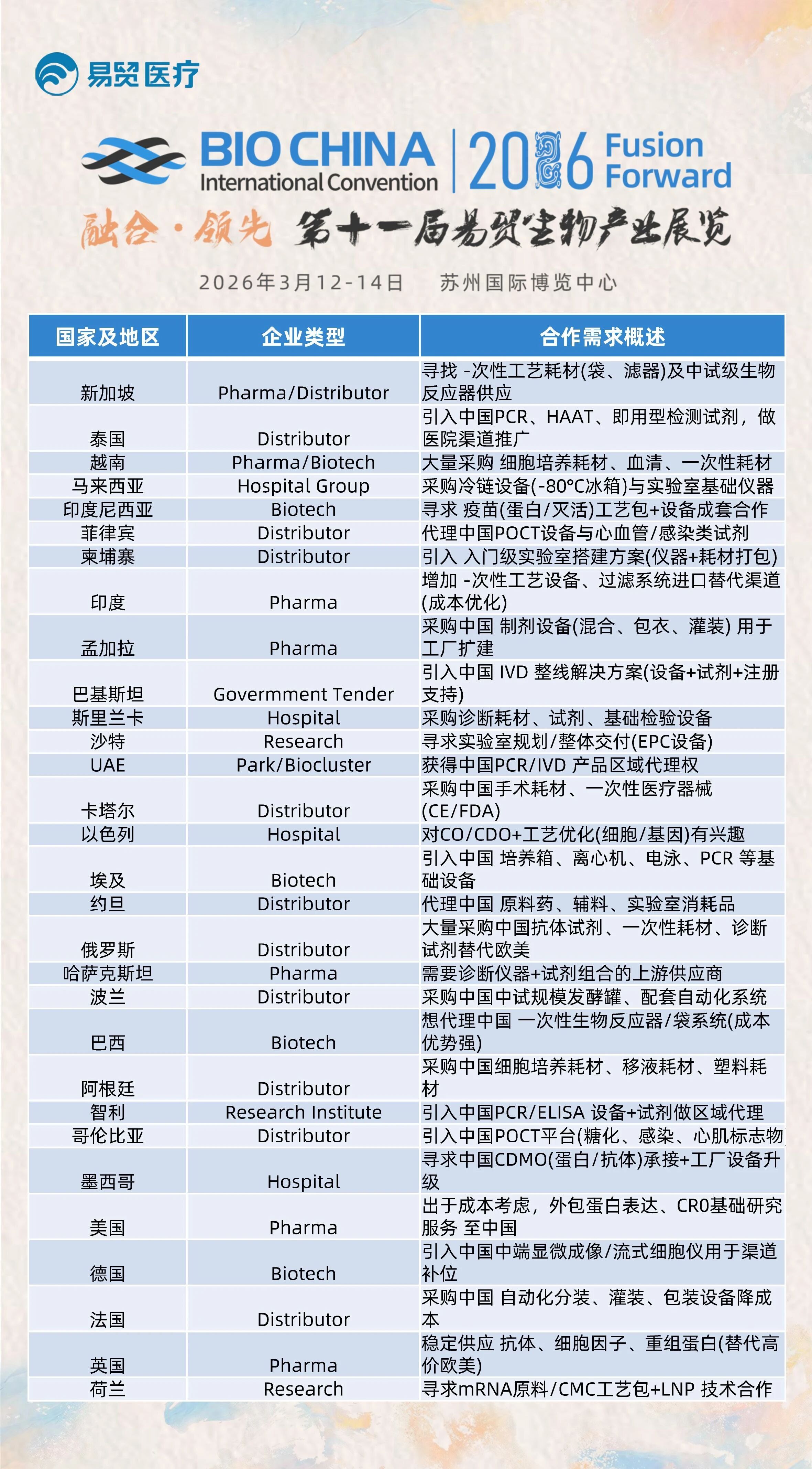 不仅如此,我们已收集并整理了来自海外买家、国内采购以及经销商的部分逛展需求。参加BIOCHINA2026,您将与这些精准买家群体面对面对接,高效促成合作。