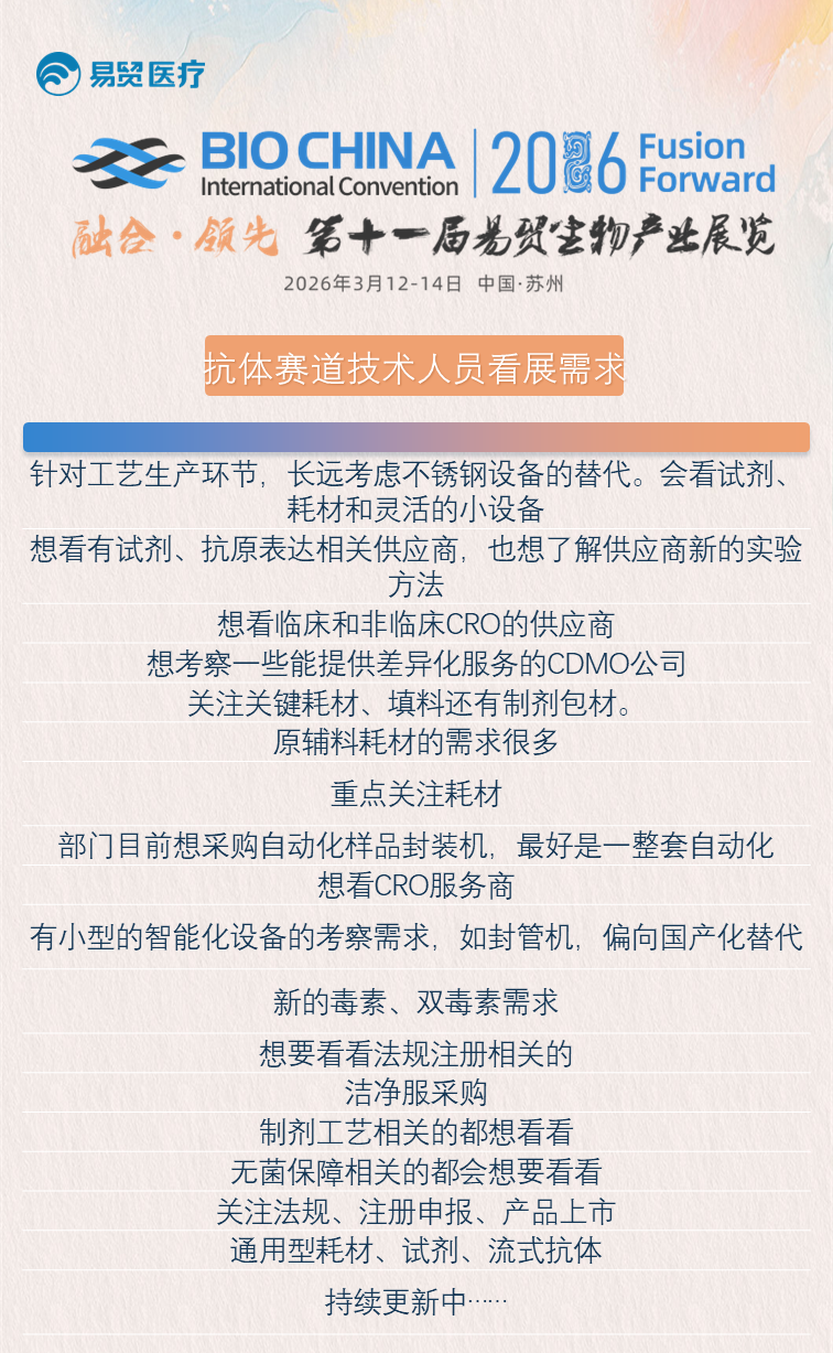 BIOCHINA 2026(第十一届易贸生物产业展览)将于3月12-14日在苏州国际博览中心召开,目前展会收到了大批抗体赛道相关的技术人员的需求,他们表达了想要逛展、看展品的意向,而这背后,正是展商不可错失的合作与机遇!