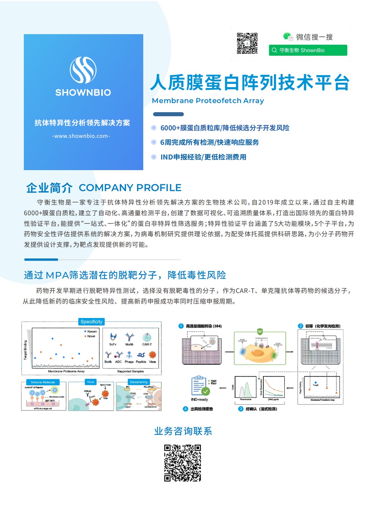 守衡⽣物是⼀家专注于抗体特异性分析领先解决⽅案的⽣物技术公司,通过⾃主构建6000+膜蛋⽩质粒,建⽴了⾃动化、⾼通量检测平台,打造出国际首家人质膜蛋白阵列技术平台,能提供“⼀站式、⼀体化”的蛋⽩⾮特异性筛选服务;为药物安全性评估提供系统的解决⽅案。守衡生物目前完成了多例已上市的单克隆抗体脱靶性研究,提供的检测数据报告已完成了中美临床申报,从而解决样品国外送检时间久,沟通成本高等一系列问题,助力研发团队的研发进程和IND申报加速,减少在研发床实验中的投入风险。