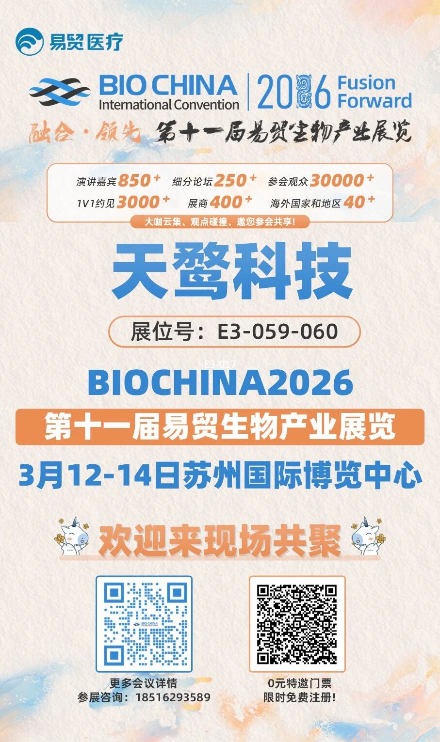 3月12-14日,天鹜科技团队将在E3馆E3-059-060展位,系统呈现基于自主研发的蛋白质设计通用大模型AIACCLBIO®研发的高品质产品及前沿药物联合开发服务,我们将全天候恭候您莅临交流!