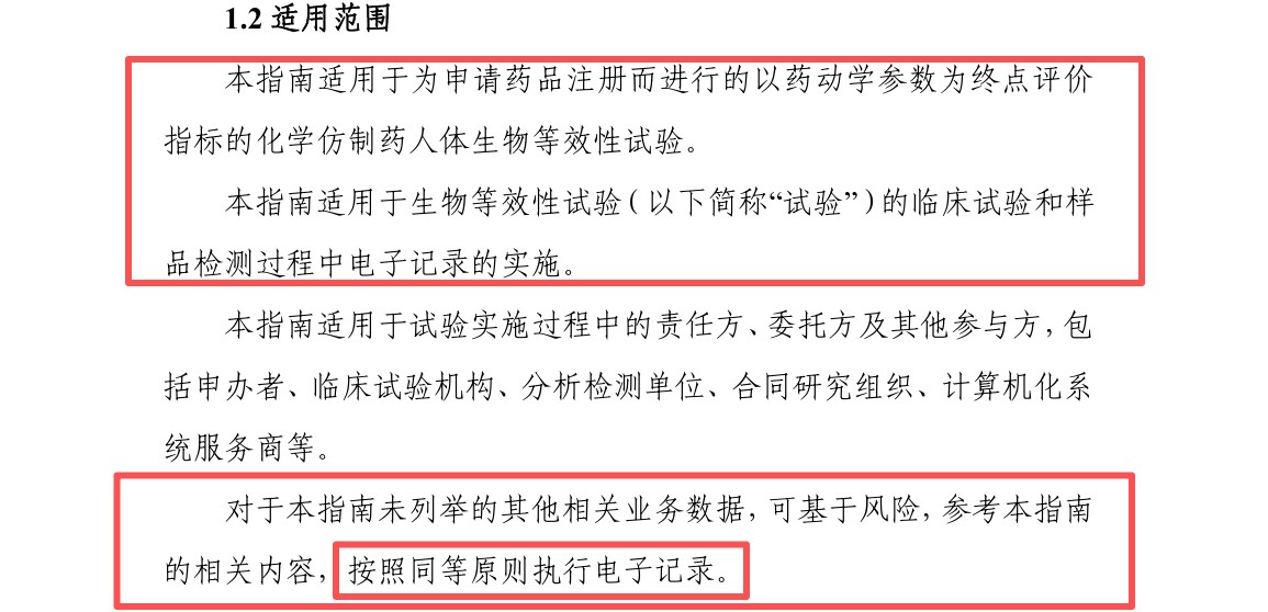 值得注意的是,虽然指南的适用范围明确指向BE试验,但同样给出了重要延伸原则:对于指南未列举的其他相关业务数据,可基于风险,参考指南相关内容,按照同等原则执行电子记录。这意味着,BE试验中的电子记录要求只是一个开始,只要向药监局提交的实验数据,都应“按照同行原则执行电子记录”。