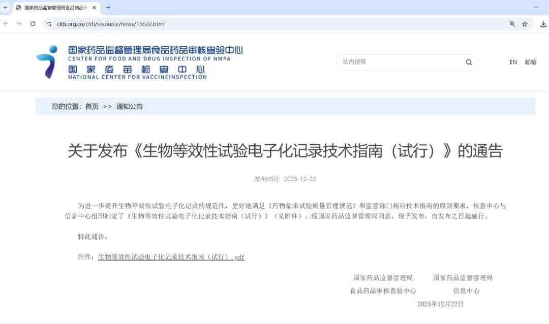 2025年12月,国家药品监督管理局食品药品审核查验中心发布《生物等效性试验电子化记录技术指南(试行)》,明确指向生物等效性试验电子化实施路径。这份指南传递了一个清晰信号:BE试验相关单位应当系统性地使用电子记录,而不是停留在“纸质为主、电子为辅”的过渡状态。指南首次在国家监管层面清晰区分了不同业务场景应采用的电子化系统类型。