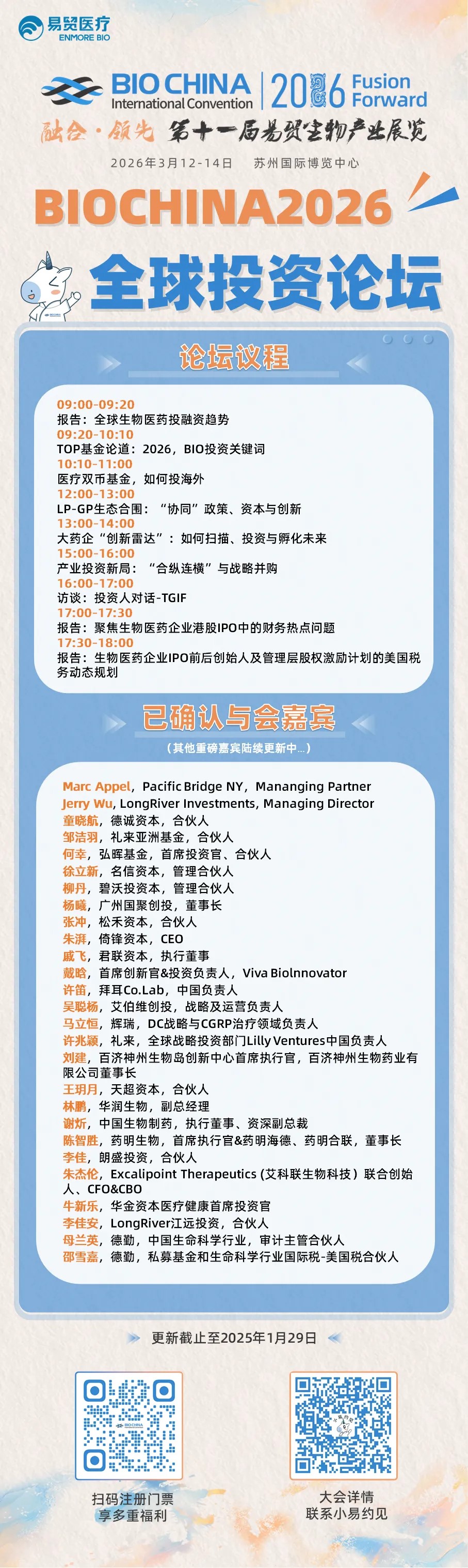 BIOCHINA2026全球投资论坛将聚焦生物医药前沿赛道投资趋势与产业协同机遇,链接全球资本、创新药企、科研转化平台及政策机构,以“资本+产业”双视角,围绕投融资趋势、跨境双币基金布局、产业战略并购整合、IPO价值重塑与回归、早期源头创新孵化等核心议题,搭建深度对话与精准对接平台,挖掘高潜力标的,推动生物医药产业资本落地与生态协同。
