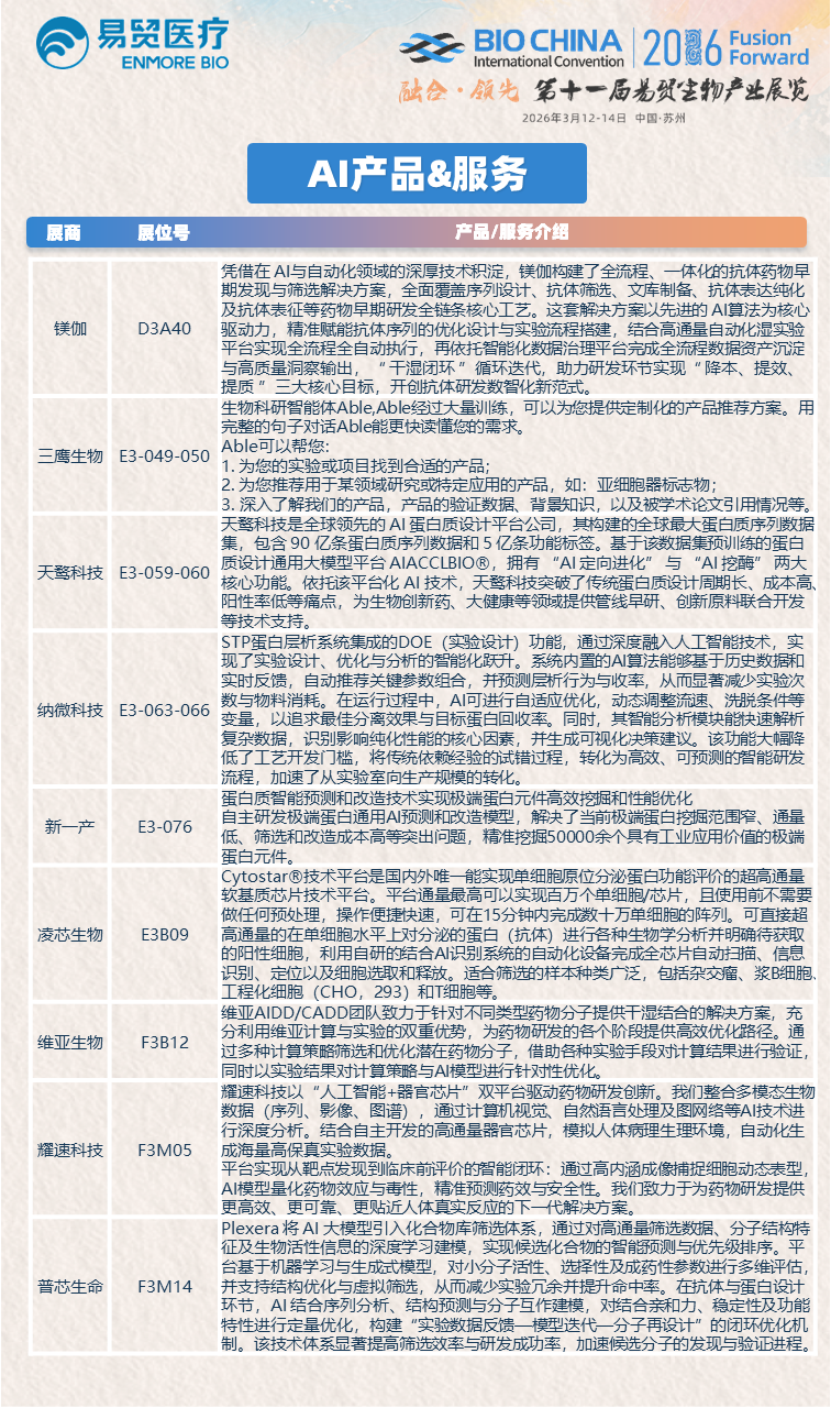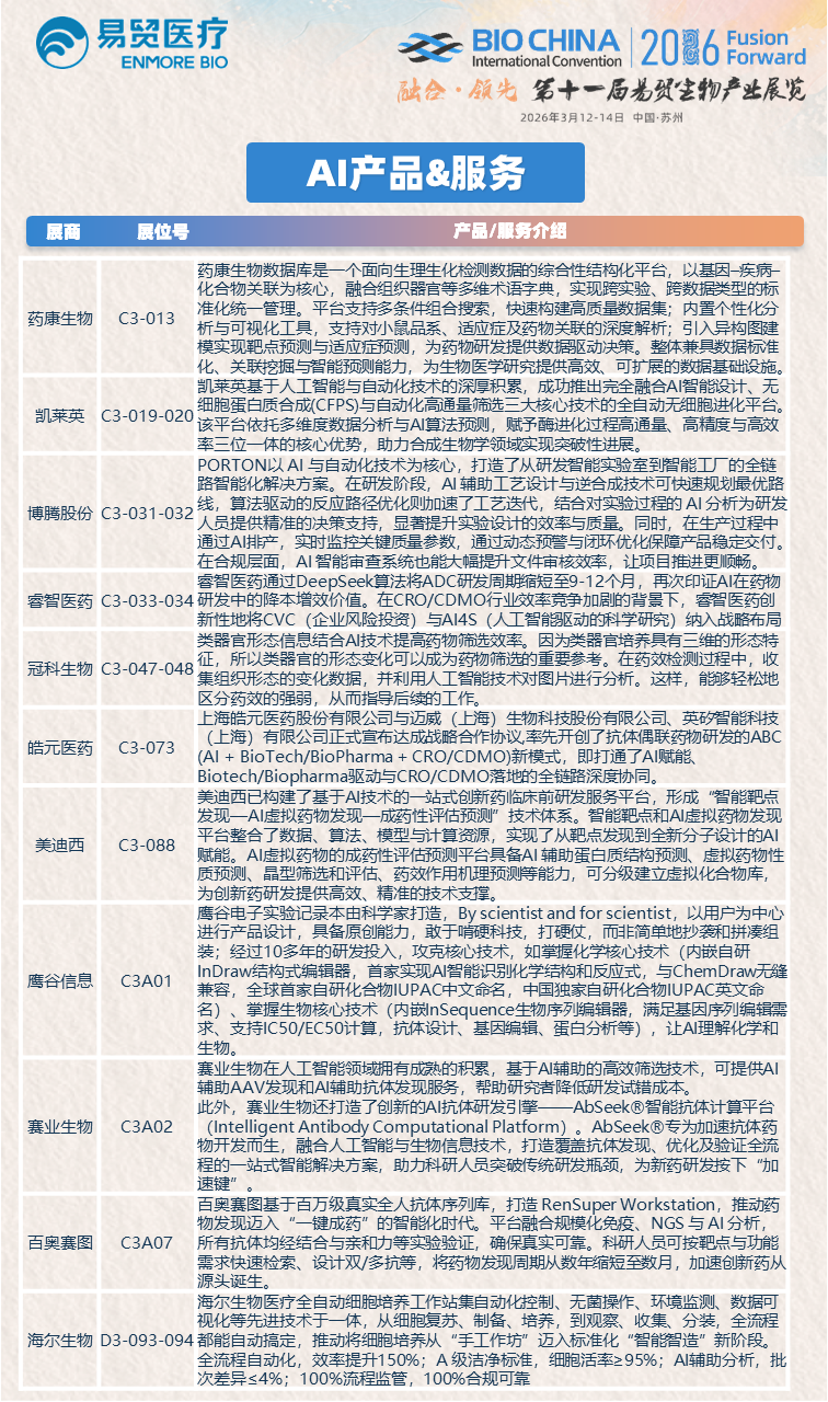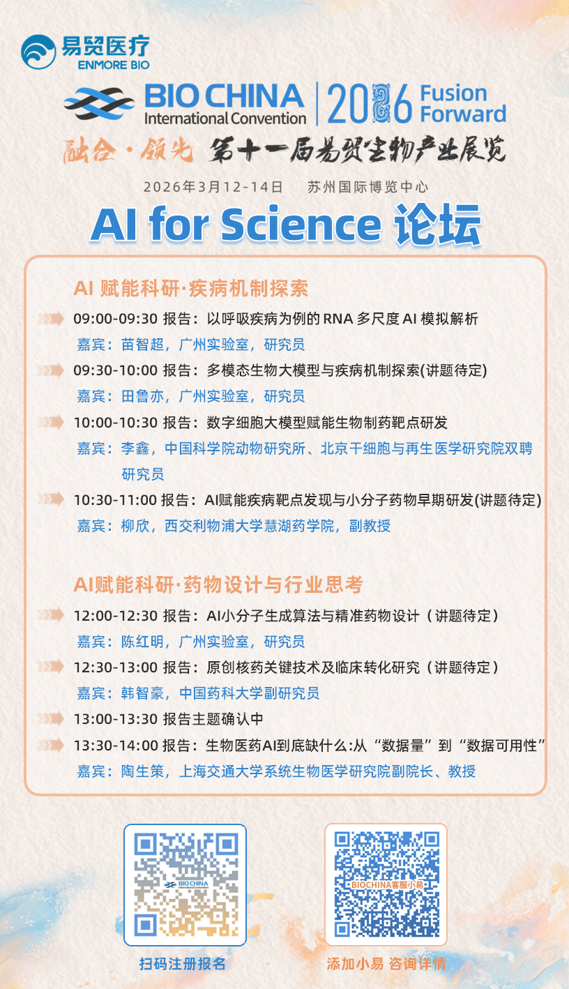 众多巨头的集体入局,印证了AI制药的重要性,同时行业也仍面临数据合规、模型可解释性不足等挑战,亟待同仁共解。BIOCHINA2026 顺势策划AI创新论坛与AI for Science论坛,3月12-14日于苏州国际博览中心启幕。论坛汇聚全球顶尖力量,聚焦AI在生物医药核心领域的应用,分享实践经验,搭建交流合作平台。诚邀生物医药行业同仁踊跃注册参会,共赴跨界盛宴,携手探索创新方向,共筑AI制药新未来!
